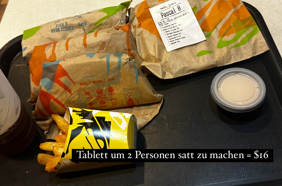 Natürlich haben wir uns durch diverse Fast-Food-Ketten geschlemmt: Shake Shack, Wendy’s, Chick-Fil-A, Panda Express, und mein Favorit, Taco Bell. Das mexikanisch inspirierte Essen ist überraschend frisch und hat mich so begeistert, dass ich es auch in Portugal, Spanien und Thailand immer wieder gesucht habe. Ich freue mich sehr auf die erste deutsche Filiale. Die Fast-Food-Erfahrungen waren unterhaltsam, und es hat uns Spaß gemacht, all die Gerichte auszuprobieren – auch wenn es eben „nur“ Fast Food bleibt. Auf diese werde ich in einem weiteren Artikel noch ausführlicher eingehen.