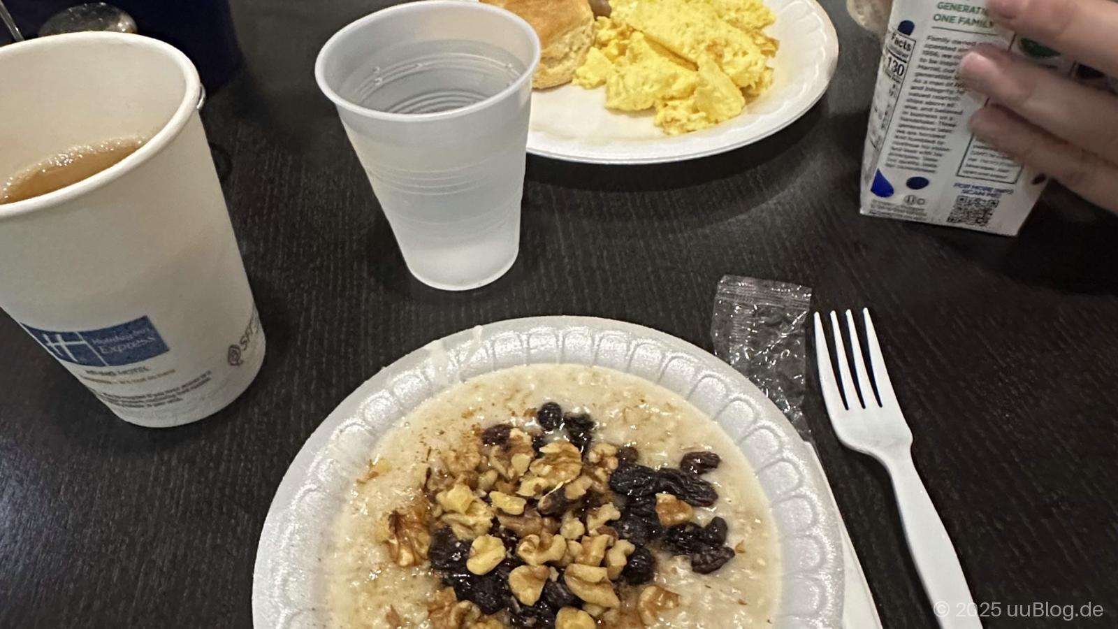 Die Atmosphäre ist eine Mischung aus hektischen Frühstückstreffen vor der Arbeit und gemütlichen Zusammenkünften, bei denen sich Freundesgruppen für ausgiebige Gespräche treffen. Hier hatten wir oft das Gefühl, typisches Essen für Florida bzw. die USA zu genießen. Auch in abgelegenen Gegenden sind die Diners morgens recht gut besucht, was für eine gemütliche Atmosphäre sorgt. Zudem kamen wir öfter mit den Bedienungen ins Gespräch und haben so Tipps für die Gegend erhalten. Das Hotelfrühstück in einem HollidayInn hat uns hingegen weniger überzeugt (siehe Bild).