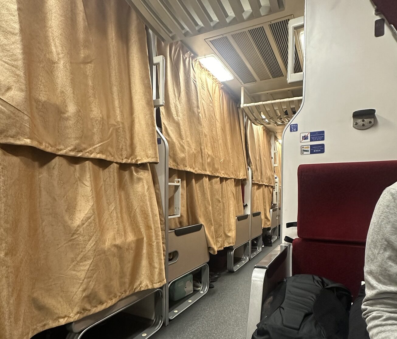 In der 1. Klasse hat man im Nachtzug in Thailand einen eigenen kleinen Raum mit zwei Betten. In der 2. Klasse schläft man in Hochbetten, die lediglich durch einen Vorhang vom Gang getrennt sind.