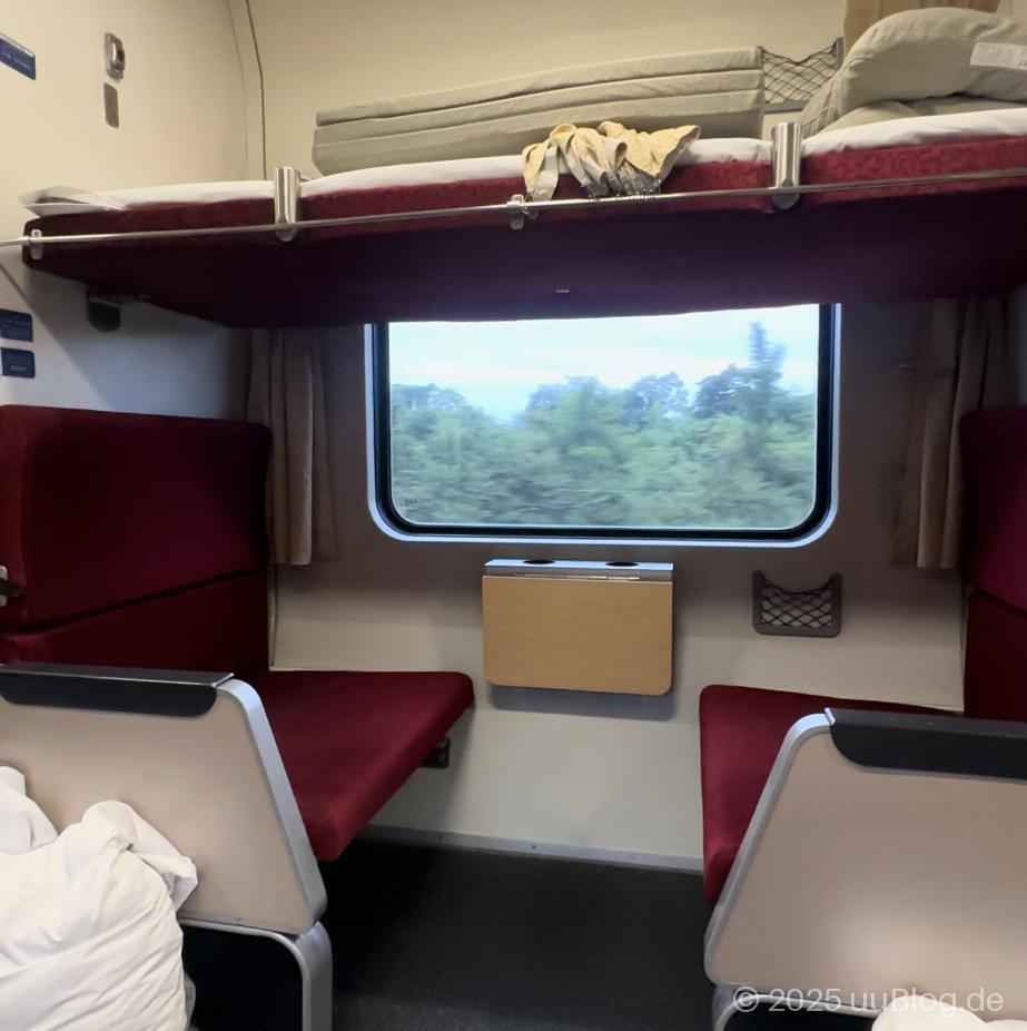 Wer das – wie ich – nicht gewohnt ist, sollte unbedingt eine Schlafmaske dabeihaben. Ich selbst habe mir eine günstige Maske von Decathlon besorgt, mit der ich sehr gut klarkam. Ebenfalls empfehlenswert: ein Pulli, denn die Klimaanlage im Zug kann nachts ziemlich kühl werden. Auch praktisch sind Schlappen, Hausschuhe oder Ähnliches, um nicht die Schuhe anziehen zu müssen, wenn man durch den Zug gehen möchte.